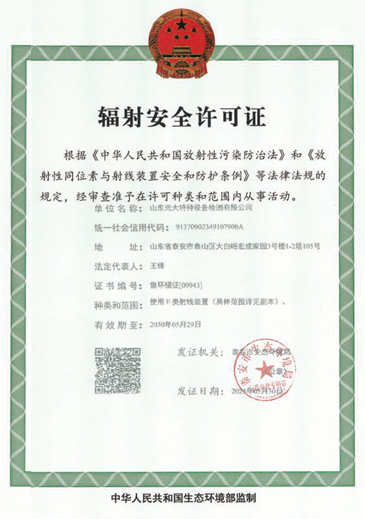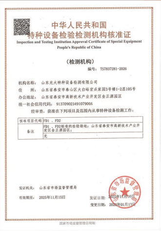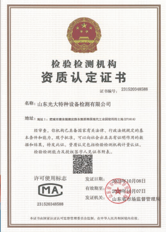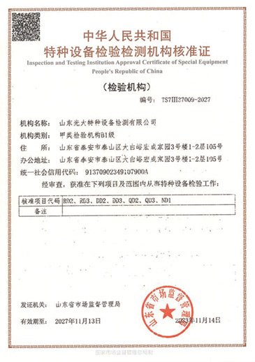 山東光大特種設備檢測有限公司是經(jīng)山東省市場監(jiān)督管理局核準的甲類B1特種設備綜合檢驗機構。2017年9月30日取得了山東省市場監(jiān)督管理局頒發(fā)的《檢驗檢測機構資質(zhì)認定證書》。2018年2月22日取得了山東省市場監(jiān)督管理局頒發(fā)的《特種設備檢驗檢測機構核準證》(起重機械)檢驗檢測資質(zhì)。2021年11月取得山東省市場監(jiān)督管理局版發(fā)的《特種設備檢驗檢測機構核準證》(安全閥在線、離線)校驗資質(zhì)。2023年11月取得山東省市場監(jiān)督管理局頒發(fā)的甲類檢驗機構B1《特種設備檢驗檢測機構核準證》,具有壓力容器(RD2...